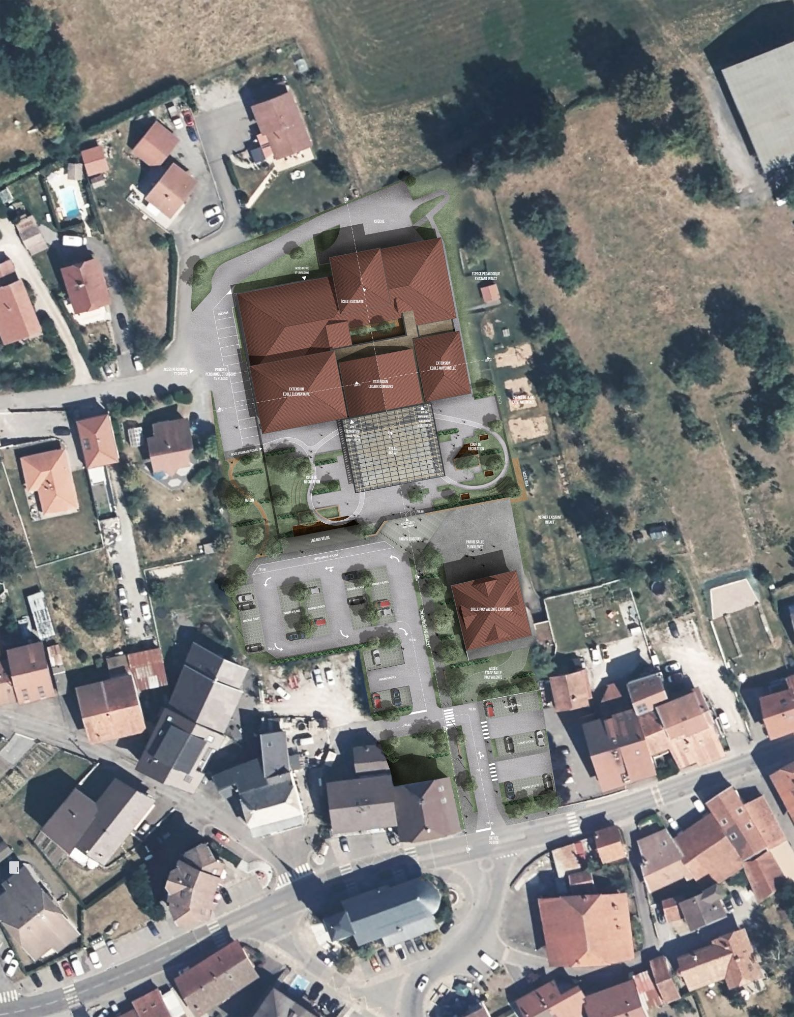 Les aménagements extérieurs sont entièrement repensés pour sécuriser et séparer les flux, en favorisant les déplacements doux, notamment en lien avec le centre du village et la salle des fêtes. Un mail piéton principal relie la route de la Touvière aux bâtiments emblématiques du village – mairie, église, salle des fêtes et école – créant une connexion forte au sein du tissu communal.
