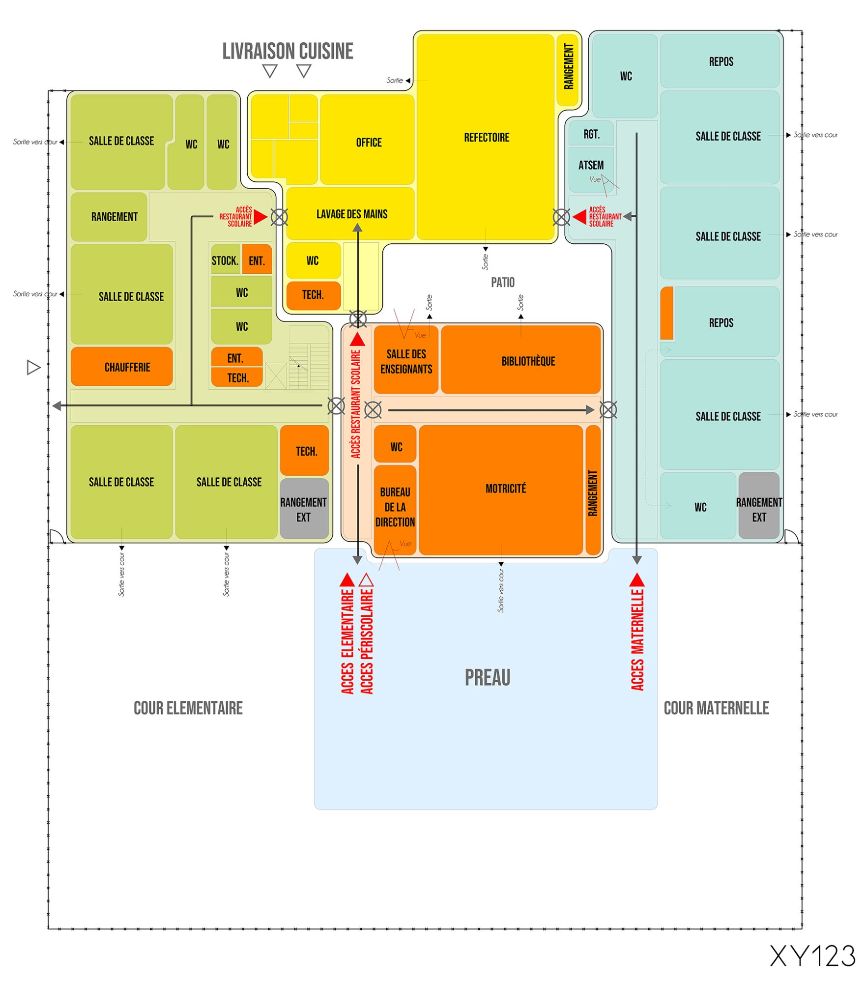 L’extension du groupe scolaire prévoit l’ajout de deux entités nouvelles, tout en conservant l’organisation actuelle de la partie existante. Néanmoins, le schéma fonctionnel proposé présente une faiblesse importante : il ne permet pas un accès direct et abrité à la demi-pension pour les plus jeunes, qui doivent soit traverser l’école élémentaire, soit sortir à l’extérieur pour rejoindre le réfectoire.