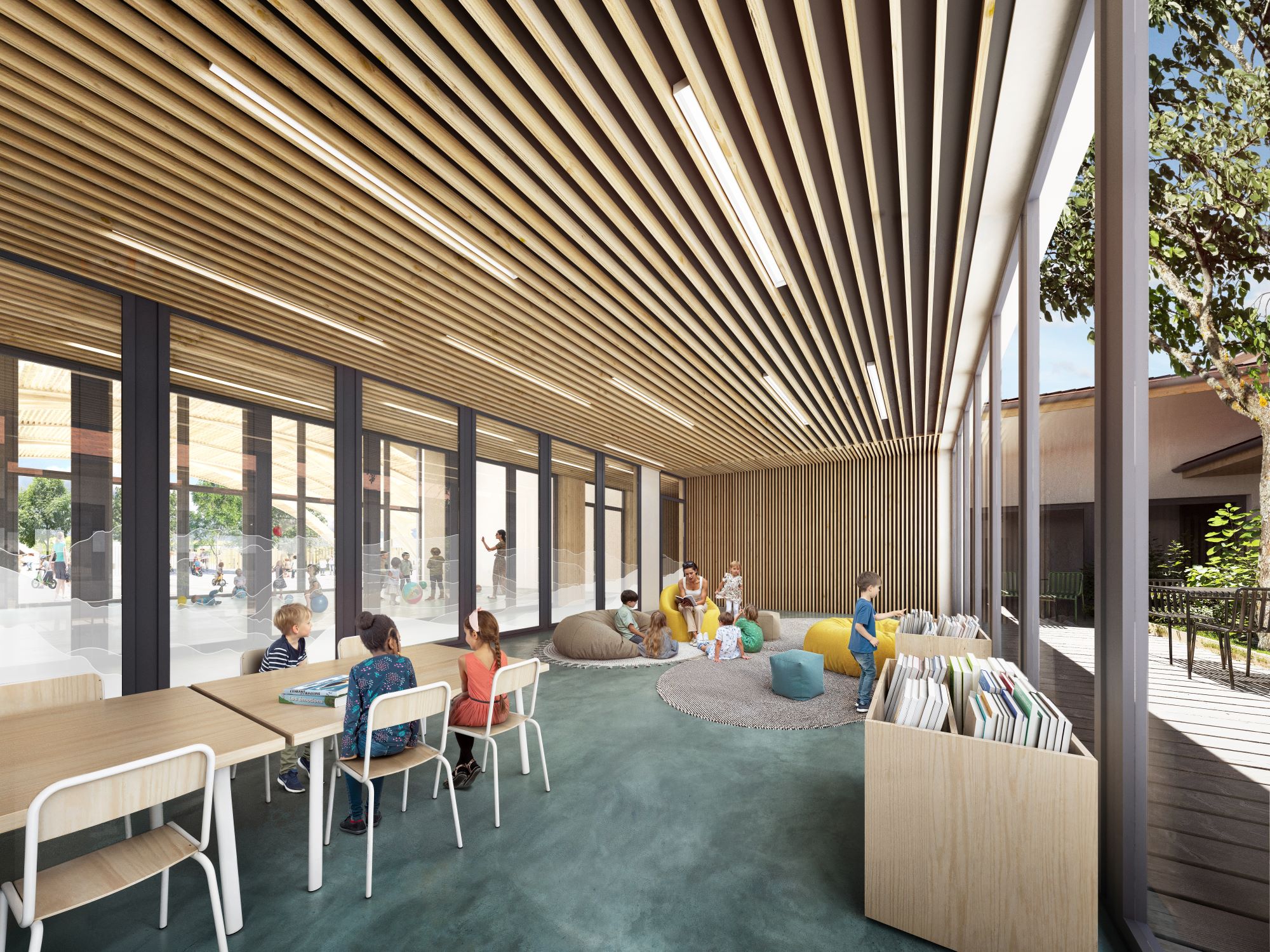 Ces espaces communs sont rassemblés dans une trame centrale, située à l’interface des deux écoles, facilitant un accès direct et indépendant pour chacune d’elles. Le préau partagé prend place dans le prolongement de cette trame. Doté d’une structure remarquable et d’un volume généreux, il confère une nouvelle identité au groupe scolaire, tout en offrant une grande polyvalence d’usages : activités ludiques, sportives ou festives, pendant et hors du temps scolaire.